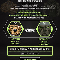 Motivated Prodigy Elite Group Training Specializing in Speed, Agility, Strength, & Conditioning MVP Camp Monthly Sessions 2 Days a Week Pricing Options •Different Breed Package: $200 Sundays 10:00am & Wednesday 6:30pm ( renews each month) •Pay as You Go: $40 ( pay before each session starts) • Motivated Prodigy Sunday Package: $120 10:00am ( renews each month) Different Breed Group Training SALE 30% off: for the month pay by September 6th. Different Breed Package -Training Sundays & Wednesdays - Advanced, High -Intensity Development - Designed for athletes ready to separate from the pack Motivated Prodigy Package - Training Every Sunday - Focused on strength, speed, agility , and discipline. - ideal for athletes building consistent weekly performance. Private Training Sessions Contact : 443-261-6793 Location : Contact 443-261-6793 We are accessible and can travel to your location Payment Options •Venmo: @motivatedprodigy •PayPal: motivatedprodigy •Cash App: $motivatedprodigy Please send athletes First and Last name and Guardian Name with payment. There will be a waiver to sign before your first session starts. Join us to elevate your speed, agility, strength, and conditioning!
